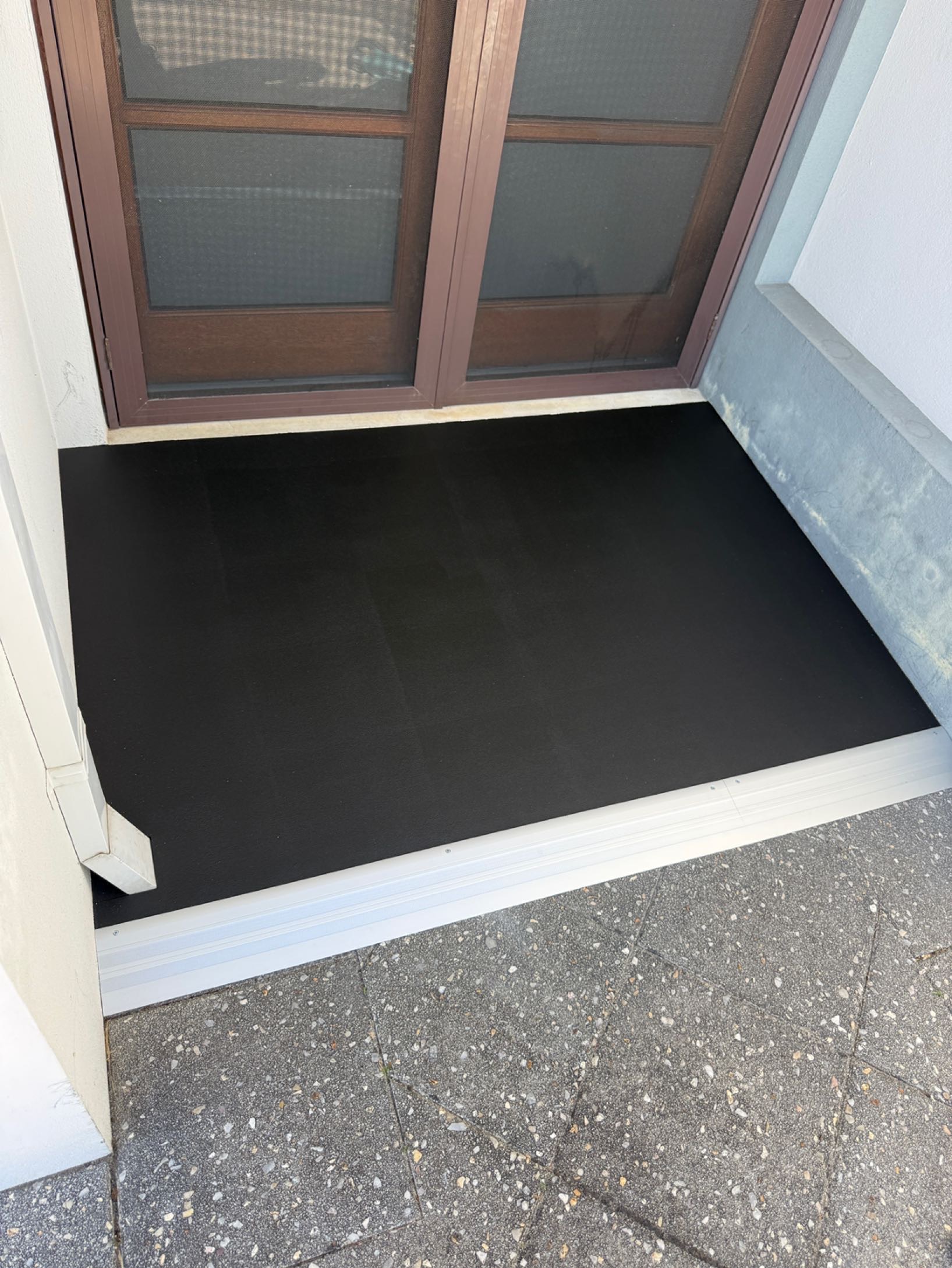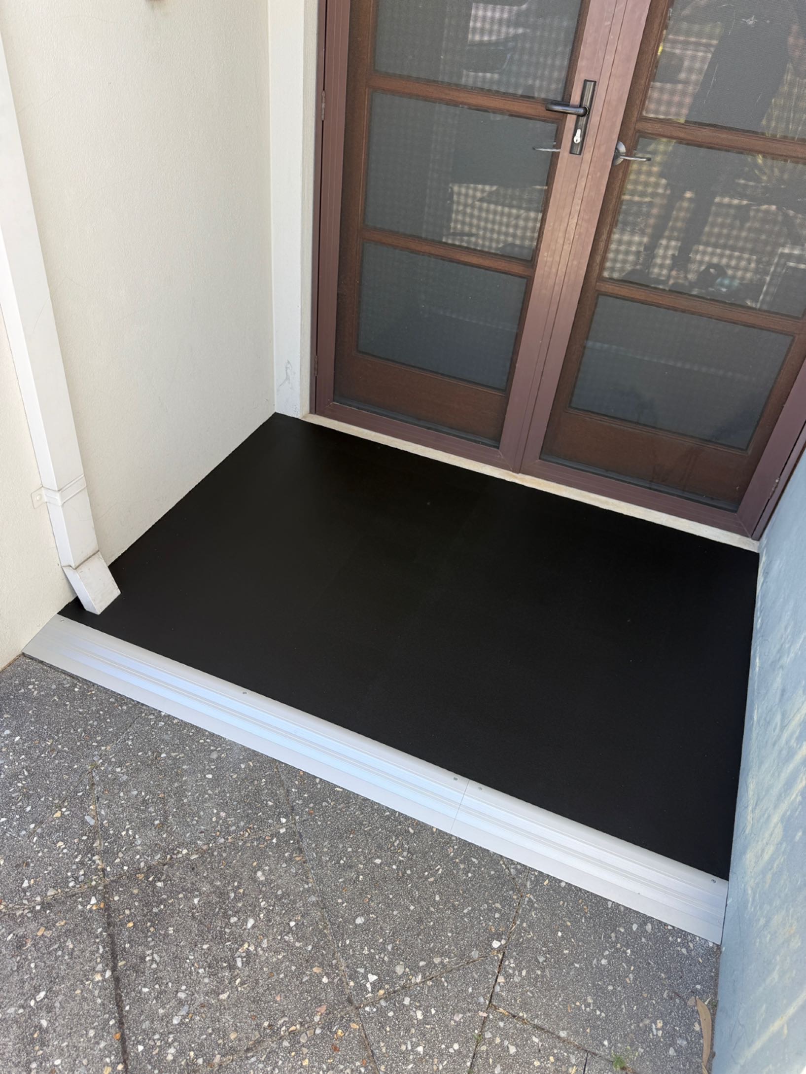 Outside, we designed and installed a custom 1:12 timber ramp, finished with a durable marine‑ply grip surface to provide stability in all weather conditions. Inside, the transition is completed with a 1:10 rubber ramp, creating a smooth, seamless flow between levels without compromising the look or usability of the space.